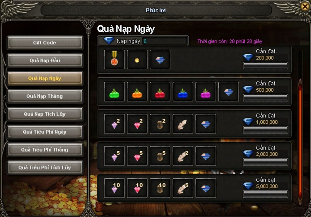 • Nhận phần thưởng khi đạt đủ mốc nạp trong ngày.