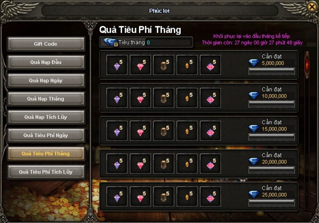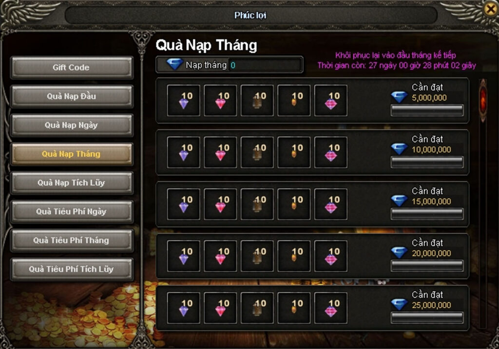 • Nhận phần thưởng khi đạt đủ mốc nạp trong tháng.