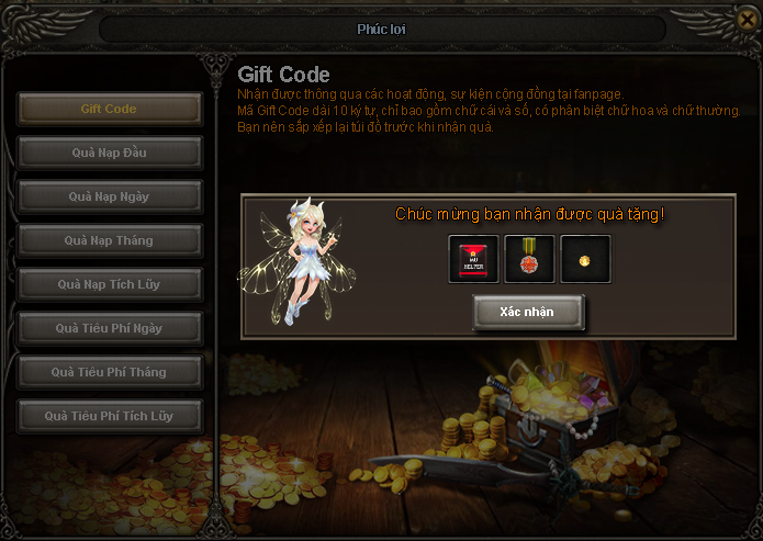 - Sau khi nhập thành công, phần thưởng sẽ: