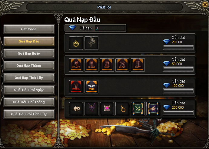 Để hành trình trở nên dễ dàng hơn, bạn có thể lựa chọn nạp đầu và nhận những vật phẩm giá trị: