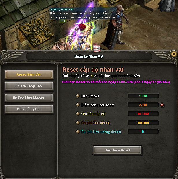 👉 Khi đạt đủ điều kiện, đến Quản Lý Nhân Vật tại Lorencia (130,126) để tiến hành Reset